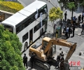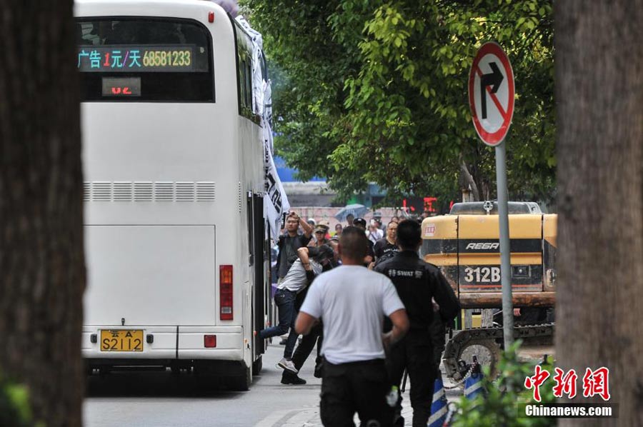 5月14日,昆明市中心南屏步行街一辆双层公交车上发生劫持人质事件。据目击者称,有一女子被劫持在一辆82路公交车内,歹徒在车窗外挂出布标。约50分钟后,警方使用爆震弹成功解救人质,犯罪嫌疑人已被控制。图为人质被成功解救下车。