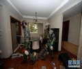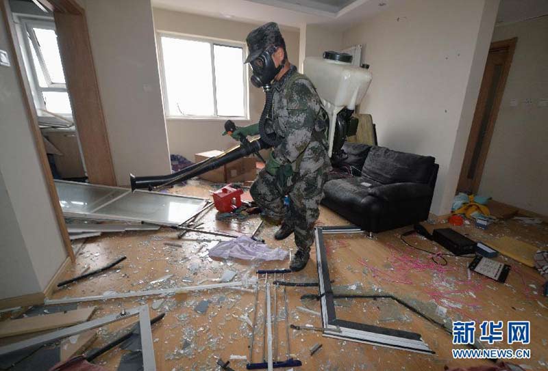 8月18日,天津汉沽人民武装部民兵进入天津港瑞海公司危险品仓库特别重大火灾爆炸事故周边的海港城小区地下空间巡查。