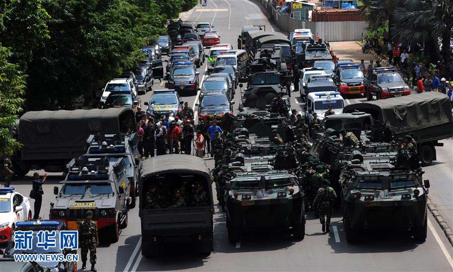 1月14日,在印度尼西亚首都雅加达,装甲车聚集在爆炸现场。印度尼西亚首都雅加达14日上午发生数起爆炸,造成至少7人死亡。警方同武装分子发生交火。印尼总统佐科对这种“恐怖行为”表示谴责。