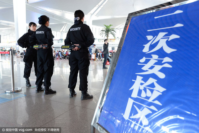 3月1日,山西太原,为确保“两会”期间进京列车和旅客安全,在旅客乘车之前需进行二次人工安检。据了解,二次安检时,旅客不需打开行李,安检员将采用手持扫描仪逐个对旅客进行人工检查,不会耽误旅客行程。图为3月1日,太原南站,候车大厅内安检员为乘车旅客进行二次安检。图片来源:视觉中国