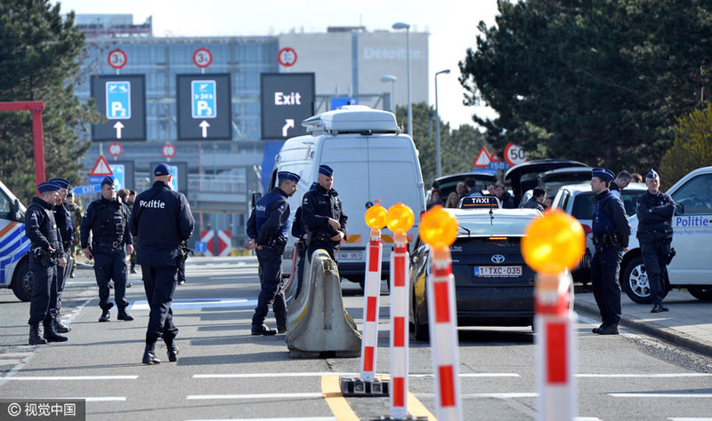 机场当局表示,布鲁塞尔航空公司的3个航班将飞往欧洲的不同目的地,分别是葡萄牙的法鲁、意大利的都灵和希腊的雅典。但是,恢复运作的机场将实施新的安全控制措施。机场将仍然对火车和大轿车关闭,乘客只能乘小车和出租车到达航站楼。图为当地时间4月3日,3月份遭遇恐怖袭击的扎芬特姆机场重新开放,警察在机场外守卫。