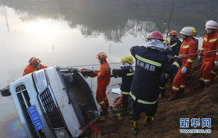 12月2日,救援人员在现场搜救。当日,记者从湖北省鄂州市委宣传部获悉,鄂州庙岭镇附近发生一起事故。一辆从鄂州开往武汉的车辆冲入路边积水湖中,初步了解客车上可能载有20人左右。目前,车辆已经被拖出水,鄂州市委宣传部介绍,已核实身份人员17人死亡。救援工作正在进行。图片来源:新华网