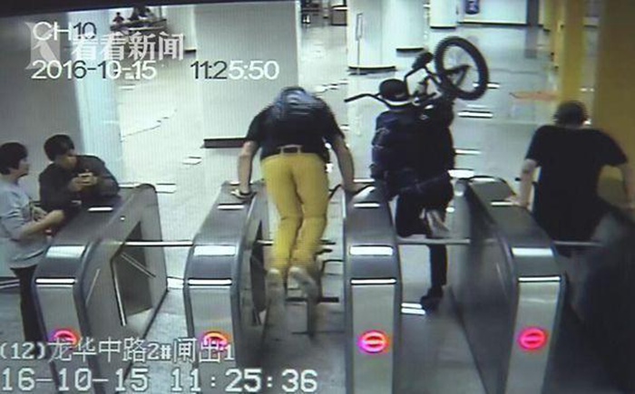10月15日上午11点多,上海地铁7号线,三名说英语的外国年轻人不听工作人员劝阻,扛着自行车逃票冲进地铁站,还辱骂工作人员,做不雅动作。