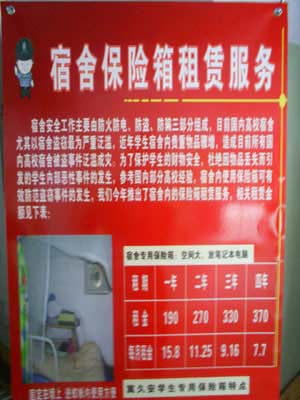 昨天下午,在河大顺和公寓一个楼梯口,记者看到几个大学生正围着一张贴有“宿舍保险箱租赁服务”的展板议论纷纷。