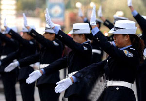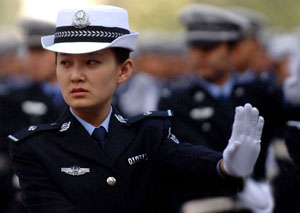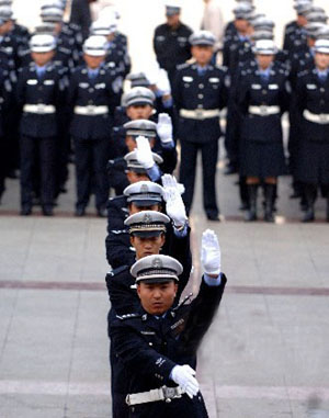 9月28日,西宁市的女交警在参加演练。 当日,青海省西宁市公安局交警支队近400名民警在西宁新宁广场开展交通指挥新手势信号演练,为10月1日起全国施行交通指挥新手势信号做准备。