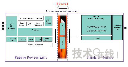将现有智能钥匙(遥控车门系统也采用相同结构)的IC(左)与NFC的IC(右)合而为一。两者通过防火墙与网络隔离,但由于携带数据记录在配置于防火墙中的闪存(EEPROM)中,因此,无论从智能钥匙、还是从NFC,均可进行数据存取。在车外使用智能钥匙的接口时,从左侧进行存取,在车外使用NFC时,则使用右侧的接口。