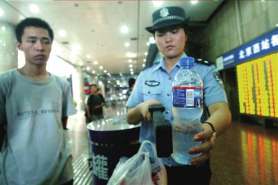 北京铁路警方昨天宣布,为确保奥运会安全,铁路安检从即日起全面升级,只要进入火车站就要接受各种安检。其中以前从来不要求检查的液体,从现在起也要“过机”。 目前,北京四大火车站的站前广场上均有持枪特警执勤巡逻,搜爆犬开始24小时对货物进行抽检,携带液体进站的旅客需要通过液体查危仪的检测。 液体查危仪“上岗” 昨天上午,记者在北京西站看到,进站口上方的显示屏上滚动播放着禁带物品的种类。专门负责每个进站口安检查危的工作人员已增为6人。其中4名民警负责各项检查,2名安检工作人员在安检仪两侧疏导旅客。记者注意到,旅客如手持液体饮料进站,则需开盖试饮一口;如手持没开盖的饮料,及存于包内的液体,在通过安检仪后,都必须接受液体查危仪的再次检查。 据负责检查的民警介绍,该检查仪每部价值14余万元。为了加大各大站的液体检查力度,铁路警方刚刚引进了这种新仪器。在检查时如出现酒精、汽油等禁品,查危仪上的显示屏会立即进行提示。 搜爆犬二次安检货物 据了解,目前在西站所有托运的物品在经过安检仪的检查后,还需经过搜爆犬二次安检。上午9点多,记者在西站货物行李托运处看到,5只搜爆犬在训犬员的带领下,对准备托运的物品进行再次检查。与此同时,2名女训犬员的出现也引起许多车站工作人员的注意。据介绍,目前北京铁路警方共有6名女训犬员,平均年龄只有23岁,她们和男铁警5人一组,在四大车站进行24小时的查危工作。这次也是女铁警首次在公众场合亮相, 持枪特警广场巡逻 “您好,请您出示身份证。”记者在西站广场上看到,数十名特警队员两人一组,手持防暴枪在广场上巡逻,并不时通过手持安检仪对途经广场的旅客进行检查,利用警务宝典对旅客的身份进行核查,而停在广场上的防暴车也格外抢眼。 据了解,为加强北京火车站的安检查危工作,北京铁路警方派出了被称为“尖刀”的特警,不仅24小时在北京站、北京西站和北京北站执勤,就连还没投入使用的北京南站也有特警进驻。特警们被分成若干小分队,携武器全天24小时在广场、站台等重要场所巡逻,以加大检查力度,预防重大突发事件的发生。如果在车站发现无人认领的包裹等,特警们将在第一时间拉上警戒线进行处理。 寄存处全装安检仪 记者在北京西站看到,所有的小件寄存处都安装了安检仪,旅客在存行李时,件件都要过机,凡是发现有香蕉水、油漆等禁止携带的物品,小件寄存处的工作人员都要求旅客拿出来,否则就不能办理寄存手续。 据了解,目前除了还未投入使用的北京南站,北京站、北京西站和北京北站,无论是国营的,还是个体的,所有的小件寄存处都安装了安检仪,“如果不安装安检仪,我们和有关部门将拒绝寄存处开门。”现场的一名铁警说。
