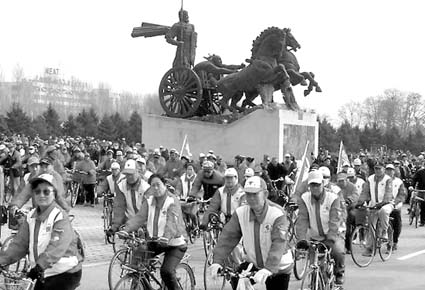 沈阳市老年奥运安保志愿者骑车宣传奥运出发仪式。