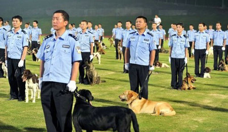 7月10日晚,由中国公安部刑侦局组织的深圳大运安保警犬技术团队240条警犬在龙岗大运中心集中亮相。警犬将担负大运场地安检、政要警卫、机动安保、机场安保、公交安检、通道安检等安保任务。
