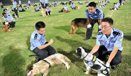 7月10日晚,由中国公安部刑侦局组织的深圳大运安保警犬技术团队240条警犬在龙岗大运中心集中亮相。警犬将担负大运场地安检、政要警卫、机动安保、机场安保、公交安检、通道安检等安保任务。