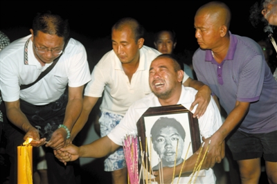 10月13日晚,泰国清盛港,遇难者家属祭祀亲人。在此次事件中失去三位亲人的文太旭悲痛欲绝。