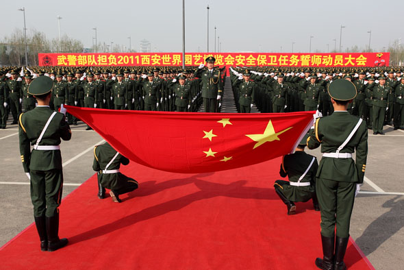 2011西安世园会,是我国继成功举办北京奥运会、上海世博会和广州亚运会后,承办的又一项重大国际性活动,也是在西北地区举办的规模最大、规格最高、时间最长的一次国际盛会。根据武警总部和陕西省及西安市统一部署,武警陕西省总队及其配属部队6000多名官兵主要担负西安世园会出入口安检、园区外围卡点武装警戒盘查、园区周边封控警戒、重要场馆安全守卫、重大活动现场安全警戒等9项任务。