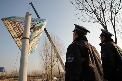 12月28日上午,北京市城管执法局依法拆除了一块违规设置于京承高速出京方向密云城东站出口100米处的大型单立柱三面广告,这是今年城管部门拆除的第88块违规大型户外广告。据悉,明年城管部门将通过建立城管远程监控系统,并与公安、交管等部门共享视频监控资源,加强对新生违规广告的远程监控发现手段。