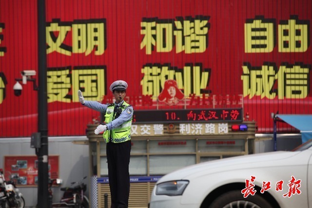 在武汉硚口区中山大道与利济路交会口,经过这里的人们经常会看到这样的景象,交警站在十字路口正中间,用标准的手势指挥着交通。在红绿灯正常工作的路口,交警用手势指挥交通已经不多见,利济路交通岗的存在是城市一道亮丽风景。