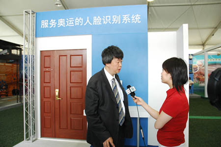 在“科技奥运聚焦展区”,一扇看上去很普通的木门引起了观众的注意。这扇门的与众不同之处就是没有钥匙孔。北京奥组委科技顾问马昕博士走到门口,门就自动顺利打开了。而另一个小伙子走过去,却被拒之门外。马昕博士解释说,这扇门的钥匙就是人脸,而秘密就在门上方的探头里。探头可以将走到门前的人脸信息迅速传递到中央处理器,经过大型计算机的比对,确定来人是否是活动名单上的人。只有提前获得许可的人才能进入。