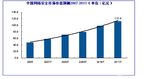 易观国际《中国网络安全市场趋势预测2007-2011》研究表明,2011年中国网络安全市场总市场价值将达到112.4亿元,从2007年到2011年的市场价值年均复合增长率为17.6%。