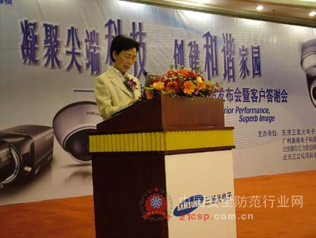 之后,主办方天津三星光电子有限公司金容宽工场长,广州瀚祺电子科技有限公司销售总监梁健芳上台致辞。协办单位代表,北京地区代理商北京赛尔汇力安全科技有限公司总经理张凤波女士和北京三立视讯科技有限公司总经理杨磊女士上台发言。