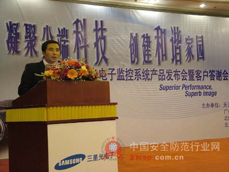 随后会议最隆重的环节——08年三星光电子监控系统产品发布正式展开。来自三星光电子中国总代理广州瀚祺电子科技有限公司的工程师耿鹏向与会来宾详细介绍了三星光电子源自军工的企业背景,讲解并演示三星光电子08年最新科技成果SVIV—第四代先进DSP图象引擎,最新推出的第四代宽动态系列产品、红外系列产品、网络系列产品等。