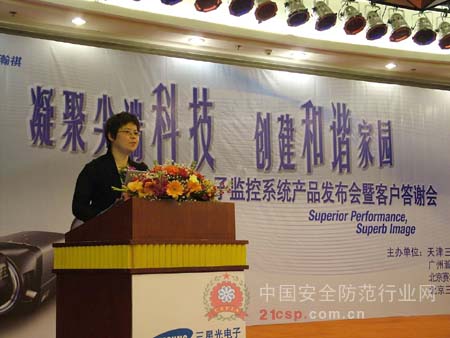 3月28日下午,由天津三星光电子有限公司、广州瀚祺电子科技有限公司主办的“2008三星光电子监控系统产品发布会暨客户答谢会”在世纪金源酒店隆重召开,近400名来自北京地区的安防人士、行业媒体以及行业领导欢聚一堂,共襄盛会。会议场面隆重,气氛热烈。行业领导——中国安全防范产品行业协会靳秀凤秘书长、北京市安防协会栗萍秘书长先后为大会致辞,分别代表中国安全防范产品行业协会、北京市安防协会对天津三星光电子有限公司、广州瀚祺电子科技有限公司在过去一年里所取得的骄人业绩以及对中国安防事业所做出的贡献表示的肯定和衷心的感谢,并就目前国内及北京的安防市场进行了分析,对三星光电子在未来的发展提出了新的希望。