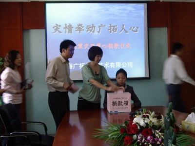 5月16日上午,在上海广拓信息技术有限公司的大会议室里,一场为“灾情牵动广拓人心”赈灾捐款仪式正在火热进行着。全体“广拓人”纷纷踊跃捐款,为灾区人民献上自己的爱心。