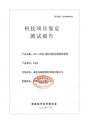 中国软件评测中心依据《GB50440-2007 城市消防远程监控系统技术规范》、《GB/T-17544 信息技术 软件包 质量要求和测试》、《CSTCJSBZ02 应用软件产品测试规范》、《CSTCJSBZ03 软件产品测试评分标准》对软件的功能、性能、兼容性、可扩充性、安全可靠性、易用性、资源占用率以及用户文档等软件质量特性进行了全面、严格的测试。测试结论表明:“GST-119NET城市消防远程监控系统V5.0” 达到了规范和标准中要求的功能和性能,在现场测试环境中运行情况稳定,通过鉴定测试。