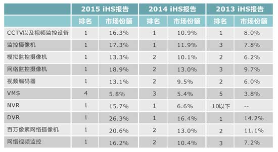 下表展示了海康威视近三年在iHS的CCTV以及视频监控报告中各个类目中的排名情况