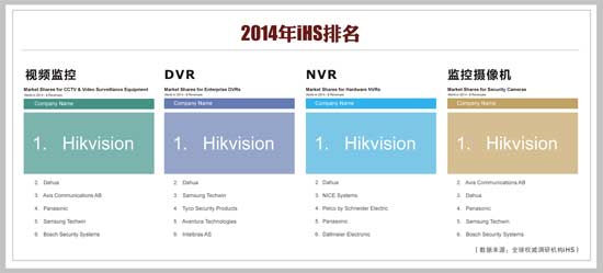 iHS报告指出,海康威视在多个类目中均排名第一,在快速发展的视频监控设备市场,海康威视更是在全球网络视频监控设备市场的份额达到了18.9%,相比去年的第二名,上升了5.9个百分点。报告同时也显现出公司在过去几年海外市场的突出表现,此次在EMEA市场(欧洲、中东、非洲)海康威视荣获了第二名的好成绩,达到了整体市场9.2%的占有率。