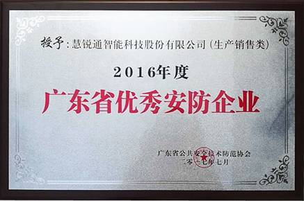 近日,由广东省公共安全技术防范协会主办的2017年度广东省优秀安防企业评选工作圆满结束,经过严格筛选和专家评审,慧锐通智能科技股份有限公司荣获“2016年度广东省优秀安防企业(生产销售类)”称号。