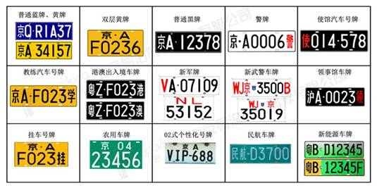 蓝牌、黄牌、挂车号牌、新军牌、警牌、新武警车牌、教练车牌、大使馆车牌、农用车牌、个性化车牌、港澳出入境车牌、澳台车牌、民航车牌、领馆车牌、新能源车牌等。