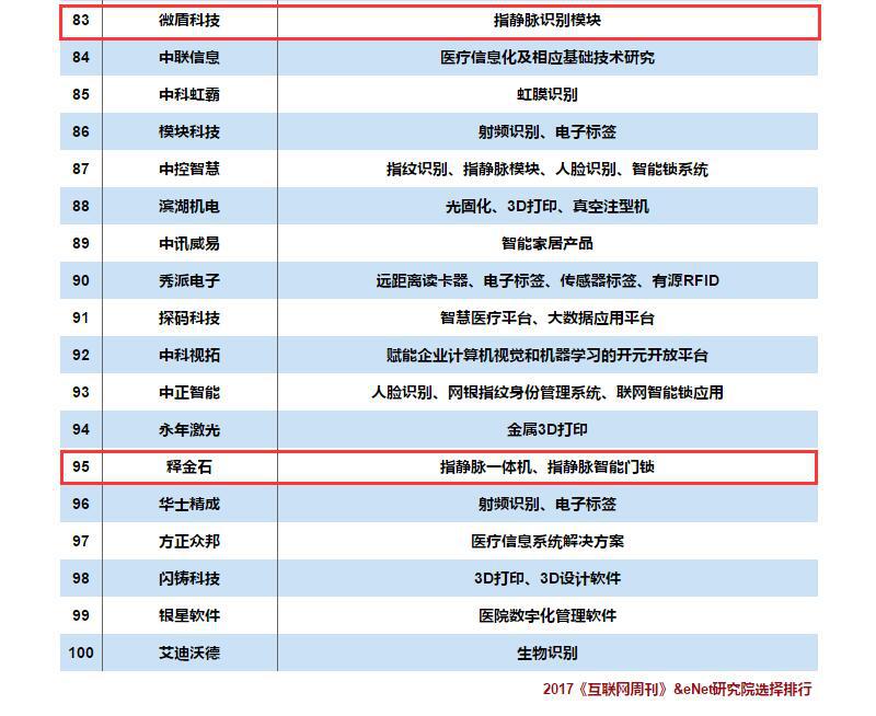 近日,权威媒体《互联网周刊》联合eNet研究院发布了“2017年度最具未来科技感TOP100”,榜单当中收录了中国最为领先的互联网、人工智能、生物识别、大数据、基因健康等多种领域的知名企业,微盾科技作为第二代生物识别技术(指静脉识别)引领者荣列TOP100榜单。可喜的是,微盾科技子公司释金石经过两年来的发展,专注成为健身行业的“一指健身”解决方案供应商,也被列入此次榜单!祝贺!同贺!