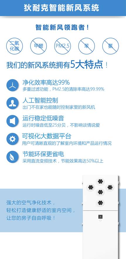 近年来,针对空净市场,国家的政策扶持和消费倡导下,空气净化行业得到了飞速发展!而新风系统凭借着通风换气+空气净化的主要功能受到了市场的热烈欢迎,新风产品成了空净市场的明星。面对这些市场机遇,狄耐克智能新风系统凭借自身的良好品牌口碑,赢得了国内许多中小学学校、培训机构、房地产商的青睐,纷纷与之合作,使用户真正体验到健康的室内呼吸环境!