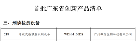 近日,由广东省科学技术厅编制的《首批广东省创新产品清单》正式发布。广州微盾科技股份有限公司开放式指静脉识别设备WDH-1100DS成功入选。