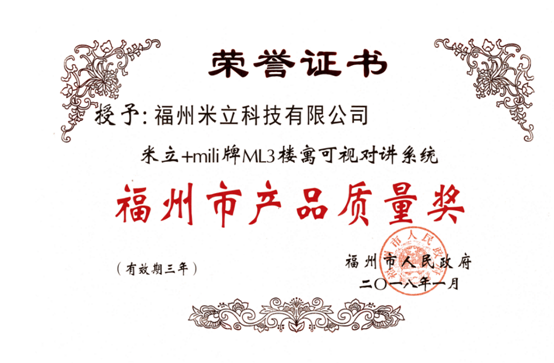 近日,福州市产品质量奖评审工作委员会对按规定程序产生的“2017年度福州市产品质量奖”候选产品进行了评审,授予福州米立科技有限公司ML3和ML8楼宇可视对讲系统“福州市产品质量奖”。