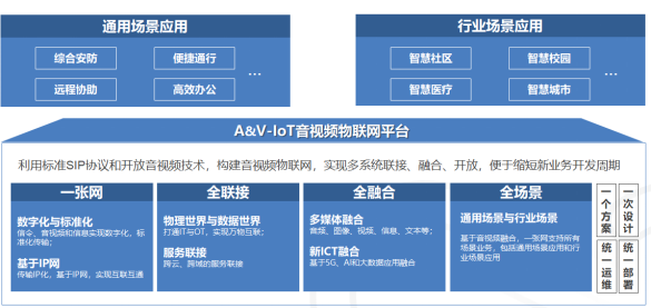 音视频物联网通过一张IP网络,打通物理、数字世界,实现万物互联。同时,音视频物联网实现音频、图像、视频、信息等全媒体融合,一张网支持所有场景业务,有利于业务的快速创新落地。