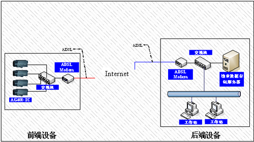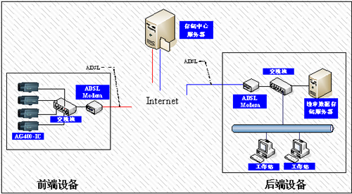工作模式:在电信IDC机房进行服务器托管,在服务器上做好相关安全防范措施后进入公网internet,路口处申请一条包年ADSL,前端相片将违章照片通过公网传输至服务器,中心存储服务器通过ADSL进入公网,连接至服务器上将违章照片取下,最后通过PC工作站连入中心存储服务器,通过违章处罚软件,打印违章处罚通知书。