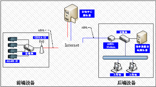 工作模式:在电信IDC机房进行服务器托管,在服务器上做好相关安全防范措施后进入公网internet,路口处使用CDMA,无线网络,将前端相片将违章照片通过公网传输至服务器,中心存储服务器通过ADSL进入公网,连接至服务器上将违章照片取下,最后通过PC工作站连入中心存储服务器,通过违章处罚软件,打印违章处罚通知书。