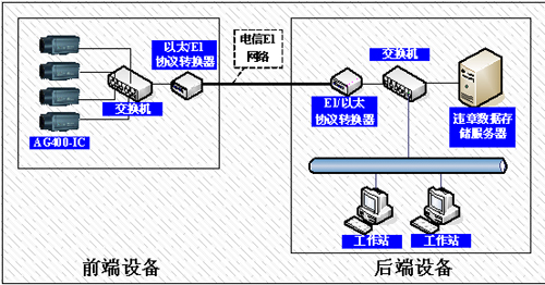 工作模式:通过租用电信E1网络,两端加上以太/E1协议转换器,使路口与中心相连,将前端照片传至违章数据存储服务器,工作站将存储服务器上取出照片,通过违章处罚软件,打印违章处罚通知书。与光纤传输模式基本一样,只是两端加了以太/E1协议转换器.