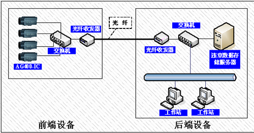 工作模式:如道口至中心有光纤直接连接,则模式为交换机(4口/8口)---光纤收发器----光纤----光纤收发器----交换机[视前端网警相机数量而定,选配交换机口数]----至违章数据存储服务器,工作站将存储服务器上取出照片,通过违章处罚软件,打印违章处罚通知书。