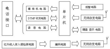 当红外线人体检测电路检测到有人体入侵时,编码电路将该检测探头的地址编码,并且经过无线发射电路将检测到有人体入侵的探头的地址发送给无线接收电路,经CPU译码后,LED显示报警地址,同时发出声光报警或者向主任拨打预先设定的电话进行报警。