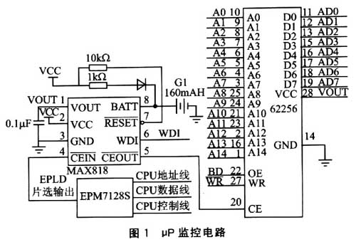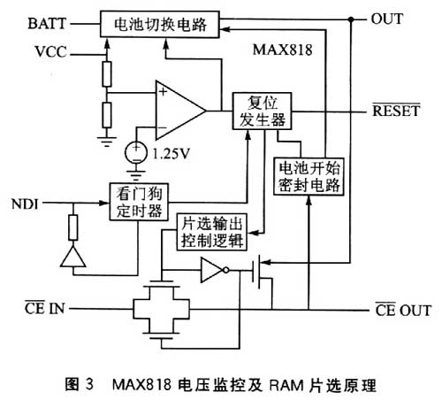 系统RAM片选信号由CPU的地址线,控制线经EPLD译码后输出接到MAX818的CEIN,经MAX818输出脚CEOUT接到RAM片选CE上。RAM的供电电源由MAX818的OUT输出引脚提供。