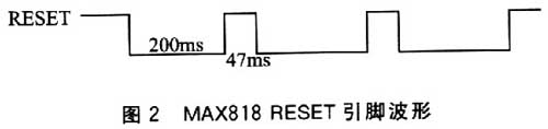 在单片机系统调试过程中,将监控芯片MAX818的看门狗清除引脚WDI悬空,使MAX818的复位功能禁止,且程序处于仿真状态,这时系统软硬件一切功能正常。仿真调试完毕,将程序写入Flash中让其运行,系统总是不停地复位、重启。MAX818的复位脚不停地发出复位信号,用示波器观察的波形如图2所示。