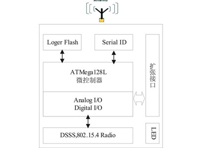 典型的终端节点和汇聚节点设计如图4所示,采用Atmel的8位RISC结构低功耗ATMegal1281VMCU作为系统控制核心。采用512KB的AT45DB041D作为外部程序存储器。射频模块使用Atmel的支持ZigBee协议的AT86RF230,RF功率达到3dBm,室外传输距离可达300米以上节点的扩展接口可连接模拟输入、数字I/O、I2C、SPI和UART接口,这些扩展接口使其易于与传感器及其它外设连接,例如外接光度、温温度、气压、声、地磁和加速度等传感器。