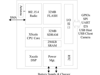 在设计无线传感器网络网关时,需要较强的数据处理能力,用以实现复杂路由协议以及信息处理等。如图5所示Crossbow的imote2节点采用了MarvellPXA271高性能、低功耗处理器。该处理器使用动态电压调节技术,频率范围13MHz~416MHz,可工作于低电压(0.85V)低频率(13MHz)模式,具备了优良的动态电源管理技术。此外,该处理器封装内集成三个芯片256KBSRAM,32MBFLASH以及32MBSDRAM,减小了体积。通过提供多种I/O,能够灵活的支持不同种类的传感器。该处理器还支持一个MMX协处理器,提高多媒体处理能力,可以用于无线多媒体传感器网络中的语音和图像处理。Imote2使用TI的CC2420ZigBee射频芯片,支持2.4GHz、16通道250kb/s数据传输,发送功率-24~0dBm。有效通讯距离是30米,可以通过SMA接口外接天线来增加传输距离。