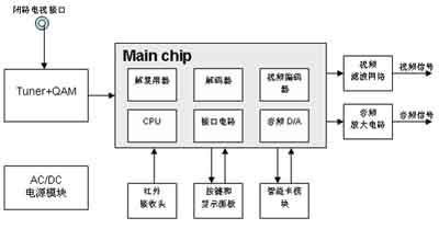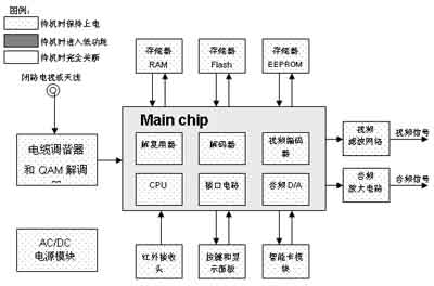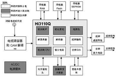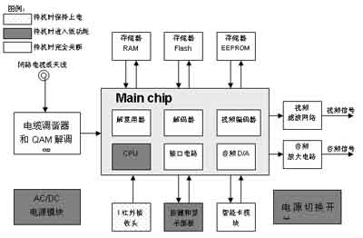 可见,机顶盒的主要功耗在于电源模块、主芯片和外围器件。待机时外围器件可以通过电源切换开关来关闭,关键是选用低功耗的主芯片、提高电源模块的转换效率。