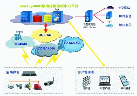虽然3G网络作为视频监控业务的承载平台还存在一些缺陷,但相比2G/2.5G而言,更高的带宽还是可以开展很多以前无法实现的视频监控业务。目前烽火网络公司基于SmartEye6000系统已经开发出了基于手机客户端进行视频监看;利用手机上的摄像头进行视频监控,使手机成为移动监控点;还有在现有的有线视频服务器和IPC等前端设备上集成3G数据模块,实现无线功能的视频服务器和IPC等业务功能,满足了运营商开展丰富多彩的移动视频业务的需求。