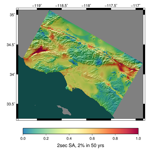 橡树岭国家实验室的超算项目还包括CyberShake地震危险性地图,它能够为工程师提供设计更多地震安全结构所需的信息。图片由南加州地震中心提供。