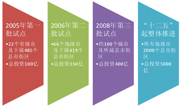 我国平安城市建设从科技强警战略和“3111”试点工程二大项目开始。第一批科技强警示范城市历时近两年,21个示范城市建设政府投资近55亿,社会各界投资近百亿;2006年第二批38个示范城市的直接和间接投资超过200个亿;截止2008年第三批科技强警开始建设,示范城市总量已达到180多个。在这期间,“311”试点工程也在飞速的进行中,2005年第一批22个示范城市总投资在100亿元以上,2006年第二批启动了66个地市以及下属419个市、县和街区,总投资也在百亿以上。2008第第三批启动了约100个城市试点,总投资达到400亿元。总体来看,自2004年国家提出创建平安城市、平安社会的活动已有10年多的时间,总投资已达到千亿以上。