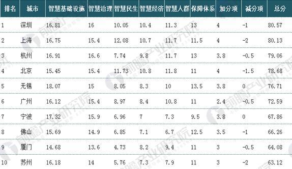 此次评估得分前十名的城市分别是深圳、上海、杭州、北京、无锡、广州、宁波、佛山、厦门、苏州。其中深圳和上海得分超过80分,领跑其他城市,杭州、北京、无锡、广州四个城市成绩均在70分以上,智慧城市建设成果突出,而宁波、佛山、厦门、苏州四个城市成绩则在60-70分之间,智慧城市建设成果相对较好。总的来看,前十名城市在总分成绩上存在一定差距,但每个领域得分较为均衡,说明以上城市的智慧城市建设注重均衡发展,这为我国其他城市建设提供了良好的标杆示范。