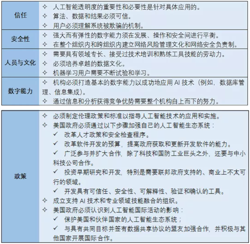 该报告认为,政府除了对AI基础研究和政府所需AI技术加强投资,还要积极构建AI生态系统,以确保政府具有应用AI的基本能力。尤其在国家安全部门和情报部门,只有拥有强大的AI生态系统,才能更好地利用AI技术并迅速转化为军事能力。AI生态系统包括:AI人才和知识管理,应用AI的机构应具有的获取、处理和利用数据的能力,保障AI的可信任、安全和可靠水平的技术基础,以及发展AI所需的投资环境和政策框架。
