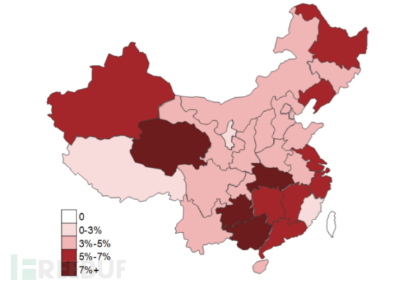 图:各省存在僵木蠕等恶意程序的单位占比情况——《2019健康医疗行业网络安全观测报告》